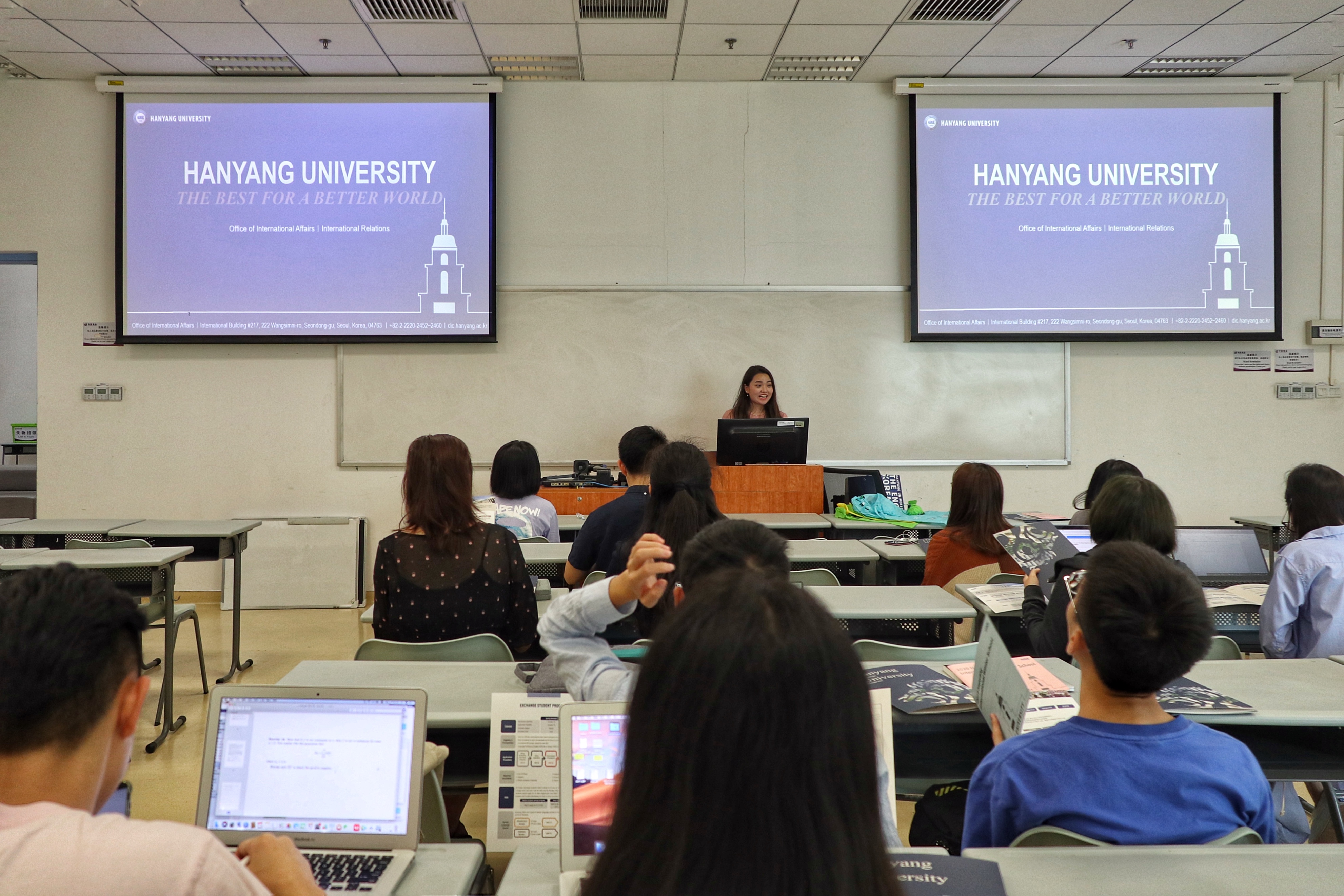 会后,汉阳大学寒暑期项目宣讲会于知新楼102顺利举行。Lydia Yoon 女士向我校学生详细介绍了汉阳大学的建校历史以及寒暑期项目的具体细节,并与学生进行问答交流,现场气氛活跃。