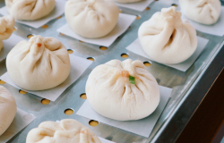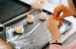 拎着自家的零食饮料水果,步入学勤食坊,两排桌子上摆好着熟悉的餐盘,旁边放着小碗小碗已拌好的肉馅,舀出一勺闻一闻,竟然有想“生吃”的欲望。拿出保鲜膜覆盖在餐盘上,看着师傅将醒好的面团揪成小块的模样,沾点面粉,轻轻按压,教同学们用擀饺子皮的方式旋转擀成薄且宽的包子皮。左手摊开面皮,右手舀馅,涂抹在中间,适量即可(否则会像小编一样包不住皮),随后,提起边缘的一角,拇指和食指捏合,接着顺时针方向层层叠合,形成花苞一般的形状,收拢四周的褶皱扭在中间,抓起顶端,借重力的作用贴合妥当放在案板上,最后,交给蒸腾的热气和氤氲的期待。